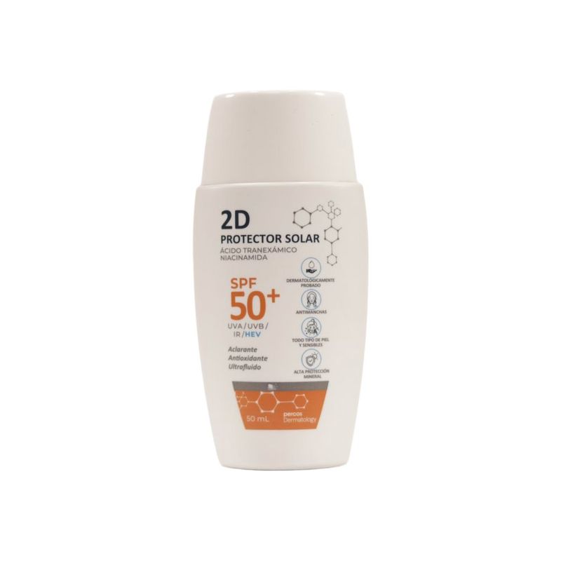 2D PROTECTOR SOLAR Con tecnología patentada Dragosine® ofrece una defensa integral contra los rayos solares UVA, UVB, IR y luz azul HEV (luz visible de alta energía). Sus filtros minerales, tolerados por las pieles más sensibles y una fórmula con ácido tranexámico y Niacinamida ayudan a prevenir manchas y unificar el tono. Su textura ultrafluida se absorbe rápidamente, dejando la piel fresca, hidratada y con un aspecto más joven.